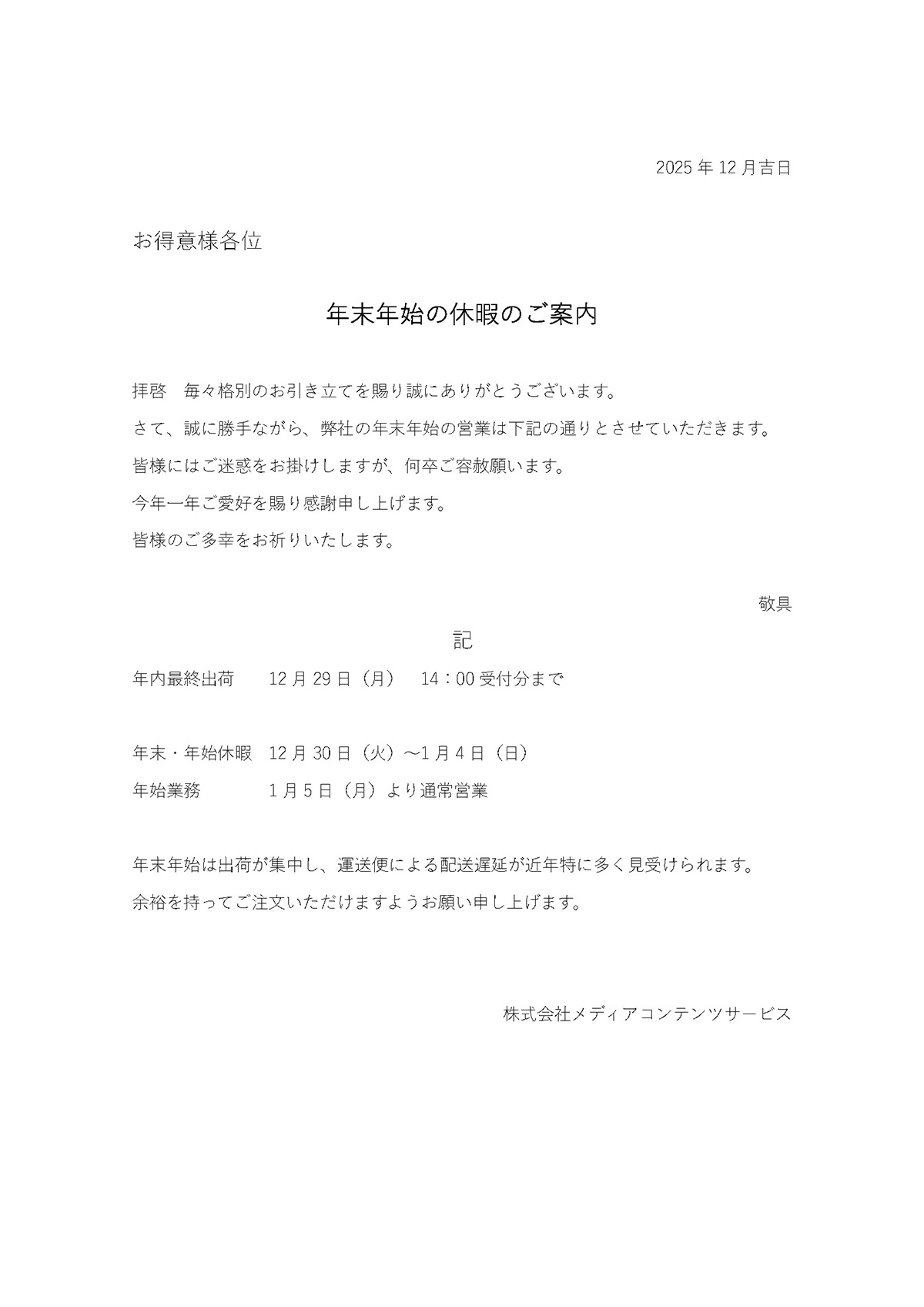 年末年始の休暇のご案内
